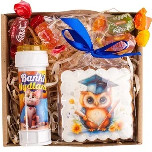 Zestaw umieszczono w estetycznym pudełku z okienkiem, wyłożonym naturalną wełną drzewną. W środku znajdują się: Aromatyczny piernik z motywem sowy (50 g) – ozdobny, ręcznie dekorowany piernik, zapakowany w celofanowy woreczek i przewiązany wstążeczką. Bańki mydlane – w kolorowym opakowaniu z zabawnym wzorem (wzory wysyłane losowo), gwarantują świetną zabawę na świeżym powietrzu. Owocowe galaretki – 4 sztuki – słodki dodatek, który ucieszy każde dziecko.