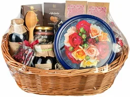 dodatkowe informacje wymiary prezentu: szerokość 45 cm, wysokość 49 cm, dno kosza 34 x 20 cm, specyfikacja opakowania: wiklinowy kosz prezentowy w brązowym kolorze; całość zgrzana folią termokurczliwą, sposób pakowania: prezent całkowicie gotowy do wręczenia lub wysłania bezpośrednio do obdarowywanego, dodatkowe opcje: możliwość dodania do prezentu kartki z własnymi życzeniami (do 400 znaków).