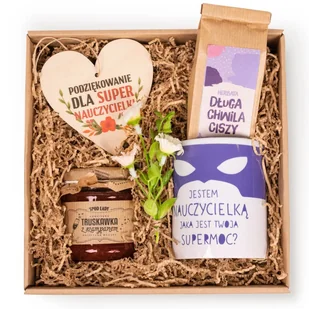 Idealna do relaksu po trudach dnia. * Konfitura truskawkowa z szampanem: 40-gramowe opakowanie tego smakołyku służy temu, aby dodać niesamowitego smaku do każdego śniadania. * Zawieszka tekturowa z napisem "Podziękowanie dla super nauczycielki": to osobisty akcent zestawu, który wyrazi wdzięczność nauczycielce za poświęcony czas i trud.