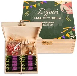 Zestaw herbat w skrzynce prezent dla nauczyciela z nadrukiem czekolada miód Wykonana z litego drewna, skrzynka zawierająca zestaw 10 sztuk herbat, czekoladkę neapolitankę oraz naturalny miodek z nabierakiem. Skrzynka prezentowa zawiera: Herbata liściasta Green Touch w saszetce 10 sztuk. Saszetka zawiera odpowiednią ilość herbaty liściastej do zaparzenia kubka 250 ml. Herbaty dobieramy losowo z naszej bogatej oferty.