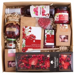 Malinowa przyjemność – wyjątkowy prezent dla Nauczycielki na zdrowie i uśmiech! Szukasz pomysłu na oryginalny i zdrowy prezent, który wyrazi Twoją wdzięczność za cały rok pracy Nauczycielki? Postaw na duży malinowy kosz prezentowy, stworzony z naturalnych składników, pełen smaku, elegancji i troski o samopoczucie. To gotowy do wręczenia zestaw, zapakowany w kraftowe pudełko z okienkiem, przewiązany subtelną wstążką i ozdobiony dwustronnym bilecikiem z kwiatową grafiką i ciepłymi życzeniami. Zawartość zestawu: Syrop Excellence o smaku malinowym (320 ml) – naturalny syrop wspierający witalność i odporność, idealny do herbaty czy wody Miód z malinami (220 g) – ekologiczny miód z polskiej pasieki, pełen wartości odżywczych i naturalnej słodyczy Maliny w syropie (280 g) – soczyste owoce zatopione w słodkim, aromatycznym syropie – idealne do deserów lub jako przekąska Herbata czarna z pąkami róży (50 g) – rozgrzewający napar o głębokim smaku, wspierający redukcję zmęczenia, w ozdobnym, kraftowym opakowaniu Czekoladowe serduszko z liofilizowanymi truskawkami – ręcznie robione, piękne i pyszne Owocowa konfitura (40 g) – losowy smak z polskich owoców, zamknięty w uroczym słoiczku Drewniana pałka do miodu – klasyczny i naturalny dodatek do zestawu Syrop malinowy (100 ml) – intensywny smak i bogactwo witamin w szklanej buteleczce Migdały w czekoladzie z pudrem malinowym – aksamitna i chrupiąca przekąska w stylowym pudełeczku Cukierki Love Candies – drobne słodkości w eleganckim opakowaniu z okienkiem i ozdobną etykietką Mleczna czekolada z owocowym mixem (120 g) – ręcznie robiona tabliczka, która zachwyca wyglądem i smakiem Dodatki i opakowanie: Opakowanie: