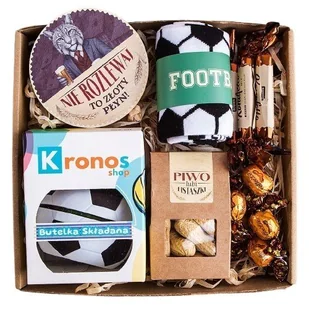 Zestaw prezentowy „Piłkarski Klimat” – idealny upominek dla fana futbolu Ten zestaw to prawdziwa gratka dla każdego mężczyzny, który kocha piłkę nożną i atmosferę sportowych emocji. Zapakowany w eleganckie pudełko z okienkiem, przewiązany ozdobną wstążką i uzupełniony bilecikiem, prezentuje się stylowo i jest od razu gotowy do wręczenia. W środku czekają praktyczne gadżety w piłkarskim klimacie oraz wyselekcjonowane smakołyki, które dodadzą energii podczas kibicowania czy spotkań w gronie znajomych. To połączenie luzu, humoru i dobrego stylu, które sprawdzi się na każdą okazję. Opis: męski prezent umieszczony w tekturowym pudełku z okienkiem, przewiązany delikatną wstążką i sprzedawany z dołączonym, dwustronnym bilecikiem.