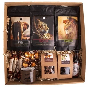 ZESTAW PREZENTOWY KOSZ PREZENT dla miłośnika kawy kawosza na urodziny 18-99 kawa ze świata kubek syrop