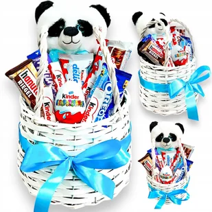 Kosz wiklinowy – Słodki Przytulas Wyjątkowy kosz prezentowy zawierający ślicznego, pluszowego misia pandę w towarzystwie pysznych, słodkich rarytasów w posta...