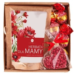 Herbata czarna z pąkami róży (50g) – specjalnie skomponowana z myślą o Mamach, łagodzi zmęczenie, a jej głęboki aromat i kwiatowe nuty wprowadzają w stan relaksu. Zapakowana w kraftową torebkę z elegancką etykietą. Czekoladowe cukierki (3 szt.) – słodkie i efektowne, w czerwono-złotych owijkach – idealna, mała przyjemność. Ręcznie robione czekoladowe serduszko z liofilizowanymi truskawkami – piękny i smaczny akcent, który podkreśla wyjątkowość tego prezentu. Opakowanie i dodatki: