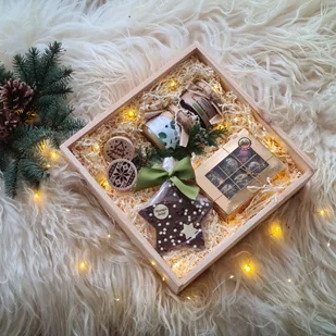 Niech to pudełko stanie się małym przytulnym komplementem, który zachwyci i przyniesie niesamowite emocje obdarowanej osobie. Jest to gotowe pudełko na prezent, w którym możesz dokonać zmian, która pasuje do Twojej okazji. Zawartość: Herbata rozkwitająca w bombonierce Miód Leśny 350g Belgijska czekolada w kształcie gwiazdki z przesłaniem świątecznym "Wesołych Świąt" Dżem aroniowy z czarną porzeczką lub śliwką - ręcznie robiony 2x Stempel drewniany do wypieku ciasteczek z motywem świątecznym Duże pudełko świąteczne LUX z dekoracją i wstążkami - kolor do wyboru Kartka Świąteczna - z miejscem na własne Życzenia Istnieje możliwość zamówienia pudełka wiązanego personalizowanego z dowolnym tekstem (imię, dedykacja, lub krótka sentencja) - tekst należy wpisać w miejsce uwag podczas składania zamówienia. Kolory pudełek do wyboru CZARNY, BIAŁY, KRAFT, CZERWONY, GRANATOWY, BŁĘKITNY, JASNO RÓŻOWY - kolor również należy wpisać w pole uwag podczas składania zamówienia. Czas realizacji na pudełko personalizowane to około 10 dni.