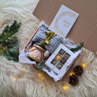 Niech to pudełko stanie się małym przytulnym komplementem, który zachwyci i przyniesie niesamowite emocje obdarowanej osobie. Jest to gotowe pudełko na prezent, w którym możesz dokonać zmian, która pasuje do Twojej okazji. Zawartość: Herbata rozkwitająca w bombonierce Podkolanówki wełniane - kolor do wyboru Miód lipowy 350g Nabierak drewniany do miodu Pudełko z dekoracją i wstążkami Kartka Świąteczna - z miejscem na własne Życzenia Możesz dodatkowo uzupełnić pudełko Lampkami LED co rozświetli prezent i na pewno zaskoczy obdarowaną osobę. (opcja dostępna na górze strony) Jeśli chcesz skomponować swój zestaw i stworzyć coś co będzie bardziej pasowało Twoim oczekiwaniom, chętnie pomożemy i zaprojektujemy GIF BOX specjalnie dla Ciebie. Masz jakieś pytania.