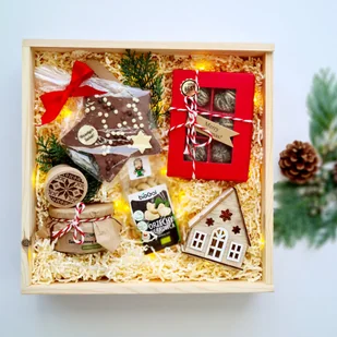 Niech to pudełko stanie się małym przytulnym komplementem, który zachwyci i przyniesie niesamowite emocje obdarowanej osobie. Jest to gotowe pudełko na prezent, w którym możesz dokonać zmian, która pasuje do Twojej okazji. Zawartość: Herbata rozkwitająca w bombonierce Dżem aroniowy z jabłkiem lub śliwką - ręcznie robiony Belgijska czekolada w kształcie gwiazdki z przesłaniem Wesołych Świąt - ręcznie robiona Miód Leśny 350g Drewniany domek z LED - zawieszka na choinkę Orzechy nerkowca Stempel drewniany do wypieku ciasteczek z motywem świątecznym Duże pudełko z dekoracją i wstążkami - drewniane lub LUX do wyboru Kartka Świąteczna - z miejscem na własne Życzenia Istnieje możliwość zamówienia pudełka wiązanego personalizowanego z dowolnym tekstem (imię, dedykacja, lub krótka sentencja) - tekst należy wpisać w miejsce uwag podczas składania zamówienia. Kolory pudełek do wyboru CZARNY, BIAŁY, KRAFT, CZERWONY, GRANATOWY, BŁĘKITNY, JASNO RÓŻOWY - kolor również należy wpisać w pole uwag podczas składania zamówienia. Czas realizacji na pudełko personalizowane to około 10 dni.