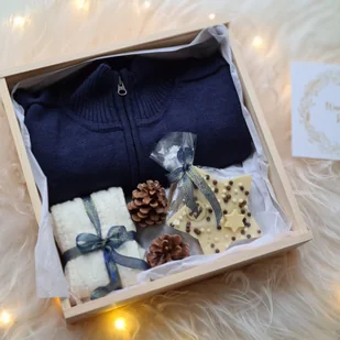 Niech to pudełko stanie się małym przytulnym komplementem, który zachwyci i przyniesie niesamowite emocje obdarowanej osobie. Jest to gotowe pudełko na prezent, w którym możesz dokonać zmian, która pasuje do Twojej okazji. Zawartość: Wełniany sweter na suwak - granatowy 100% wełna Skarpety wełniane - podkolanówki- damskie Belgijska czekolada Gwiazdka mleczna lub biała - ręcznie robiona Duże pudełko świąteczne z dekoracją i wstążkami - drewniane lub LUX do wyboru Kartka Świąteczna - z miejscem na własne Życzenia Istnieje możliwość zamówienia pudełka wiązanego personalizowanego z dowolnym tekstem (imię, dedykacja, lub krótka sentencja) - tekst należy wpisać w miejsce uwag podczas składania zamówienia. Kolory pudełek do wyboru CZARNY, BIAŁY, KRAFT, CZERWONY, GRANATOWY, BŁĘKITNY, JASNO RÓŻOWY - kolor również należy wpisać w pole uwag podczas składania zamówienia. Czas realizacji na pudełko personalizowane to około 10 dni.