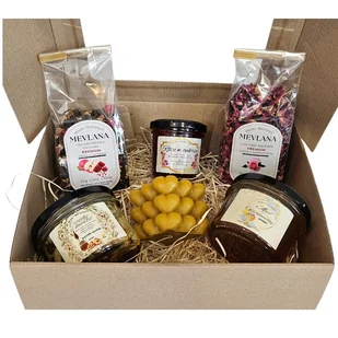 Zestaw Prezentowy nr 3 turecka herbata MEVLANA 2smaki przetwory dżem świeca Kompletny zestaw naturalnych słodkości i herbat Nasz zestaw zawiera starannie wys...