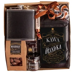 Zestaw prezentowy dla Dziadka z piersiówką, kawą i słodyczami – elegancja, smak i wyjątkowy charakter Szykowny i starannie dobrany zestaw upominkowy to idealna propozycja dla Dziadka, który ceni styl, dobry smak i jakość. W eleganckim opakowaniu znalazły się nie tylko aromatyczna kawa i słodkie przekąski, ale również klasyczna piersiówka, co czyni ten zestaw doskonałym wyborem na Dzień Dziadka, urodziny, imieniny czy święta. Zestaw zapakowany jest w tekturowe pudełko z przezroczystym okienkiem, przewiązany delikatną wstążką i wyposażony w estetyczny, dwustronny bilecik z miejscem na podpis. Zawartość zestawu: Elegancka piersiówka – czarna, pokryta ekoskórą, o klasycznym wyglądzie Migdały w belgijskiej czekoladzie – zapakowane w pudełeczko z okienkiem i etykietą 1 sztuka cukierka Konaffeto 1 sztuka belgijskiej czekoladki Roseto – w czarnym lub brązowym opakowaniu (wysyłane losowo) Kręcony lizak ręcznie robiony Karmelki – w eleganckim, małym szklanym słoiczku Kawa dla Dziadka – świeżo palona, drobno mielona, w czarnym opakowaniu z dedykowaną etykietą Produkty zostały starannie ułożone na naturalnej wełnie drzewnej, dzięki czemu całość prezentuje się estetycznie i elegancko.