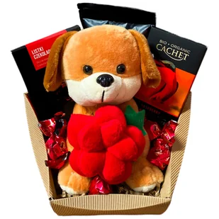 Kosz prezentowy – Dziękuję, że Jesteś Niepowtarzalny zestaw prezentowy zawierający ślicznego pluszaka z okazałym, czerwonym kwiatkiem, a także kompozycję pys...