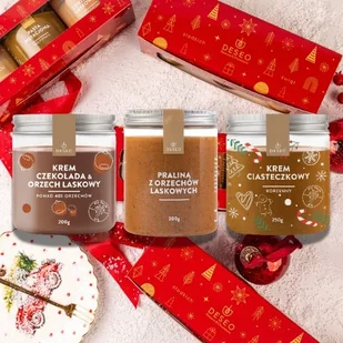 Zestaw Świąteczny Kremy Orzechowe Mix 1 od DESEO Szukasz wyjątkowego prezentu świątecznego? Nasze produkty to gwarancja najwyższej jakości składników i wyjątkowego smaku. ✨ Zestaw Świąteczny - Kremy Orzechowe Mix 1 – opis produktów: Krem Czekolada & Orzech Laskowy 200 g Przyjemnie czekoladowy z wyraźnym posmakiem orzechów laskowych, bo ich zawartość w naszym kremie to prawie 42%! Idealnie sprawdzi się jako dodatek do naleśników, gofrów, deserów, ale również jako nadzienie do croissantów, pączków czy muffinów. Pralina z orzechów laskowych 300 g Pralina z orzechów laskowych charakteryzuje się głębokim, karmelowym smakiem. Dodatek soli podbija smak orzechów i wydobywa z nich to, co najlepsze.