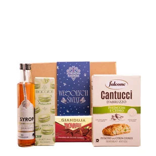 Zestaw Świąteczny Włoska Słodycz Odkryj wyjątkowy zestaw, który wprowadzi do Twojego domu ciepło i magię świątecznego klimatu! W skład zestawu wchodzi: Czekolada Noisette con Nocciole - Novi Syrop z kwiatu czarnego bzu - Schronisko Bukowina Makaroniki pistacjowe - Cuorenero Ciastka z pistacjami Cantucci - Falcone Małe pudełko ze świąteczną obwolutą
