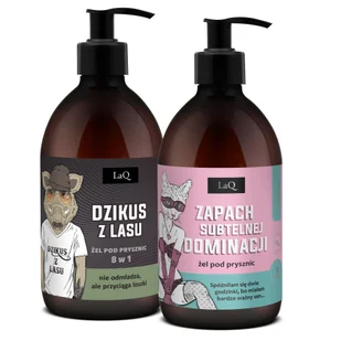 LaQ Zestaw Żeli pod Prysznic Dzikus z Lasu + Zapach Subtelnej Dominacji 2×500mlLaQ Zestaw Żeli pod Prysznic Dzikus z Lasu + Zapach Subtelnej Dominacji to duet stworzony dla pary lub osób, które cenią wyraziste zapachy i wegańskie, naturalne formuły. To połączenie siły, charakteru i zmysłowości w wyjątkowej odsłonie. Zapach Subtelnej Dominacji to żel o aromacie inspirowanym ekskluzywnymi perfumami z wyraźną, uwodzicielską nutą piwonii. Idealny dla kobiet pewnych siebie, świadomych swojej wartości. Z kolei 8w1 Dzikus z Lasu to ekstremalnie energetyczny żel dla mężczyzn - zawiera ekstrakt z dębu, pachnie luksusowymi perfumami i zapewnia ekspresowe oczyszczenie.