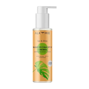 Alkmie Sun & Bronze Balsam do ciała SPF30Połączenie skutecznej ochrony przeciwsłonecznej i subtelnego rozświetlenia. Balsam ma lekką nietłustą formułę z filtrem SPF 30. Chroni skórę przed szkodliwym promieniowaniem UVA i UVB, minimalizując ryzyko oparzeń słonecznych i przedwczesnego starzenia się skóry. Drobinki delikatnie rozświetlają skórę, nadając jej zdrowy, promienny wygląd. Efekty: Ochrona przeciwsłoneczna SPF 30Subtelny, promienny blaskIntensywne nawilżenie i odżywienie skóryLekka, nietłus