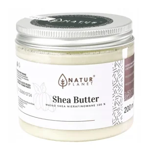 Masło Shea Nierafinowane 200ml Natur Planet Masło shea nierafinowane to olej pochodzący z nasion drzewa masłowego rosnącego dziko na sawannach Afrykańskich, jest wykorzystywane w kosmetyce dzięki bogatemu zasobowi witamin i antyoksydantów. Jest wegańskie i nadaje się do każdego typu skóry. Topnieje przez kontakt ze skórą, może być nakładany w pojedynkę lub jako baza do wykonywania naturalnych domowych produktów do pielęgnacji skóry. Masło shea nie jest komedogenne, dzięki czemu może być stosowane przy każdym rodzaju cery, od suchej po trądzikową. Witamina A i E (witaminy młodości) opóźniają procesy starzenia - dzięki czemu nadaje się do skóry dojrzałej.