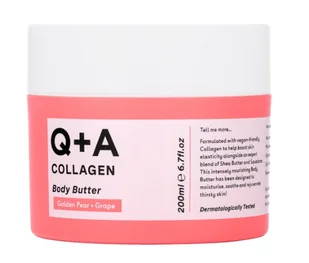 Masło do ciała Q+A z kolagenem – Pielęgnacja, która odżywia!Masło do ciała Q+A z kolagenem to prawdziwy eliksir młodości dla Twojej skóry. Bogata formuła, stworzona z myślą o najbardziej wymagających potrzebach, zapewnia kompleksową pielęgnację i regenerację. Dlaczego warto wybrać masło Q+A?Odżywienie w głębi skóry: kolagen roślinny, masło shea i olej z pestek winogron tworzą potężne trio, które intensywnie nawilża i odżywia, poprawiając elastyczność i jędrność skóryOchrona przed starzeniem: kola