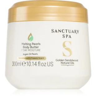 Sanctuary Spa Golden Sandalwood, 300 ml, Masła do ciała dla kobiet, Czujesz, że Twoja skóra potrzebuje intensywniejszej pielęgnacji niż ta, którą zapewnią Ci mleczka do ciała lub kremy? Masło do ciała Sanctuary Spa Golden Sandalwood będzie dla Ciebie doskonałym wyborem. W odróżnieniu od zwykłych kremów i mleczek zawiera mniej wody, ma bardziej gęstą konsystencję, a jej działanie jest bardziej odżywcze i skoncentrowane. Dogłębnie nawilża skórę, bardzo intensywnie odżywia i sprawia, że jest wyjątkowo miękka w dotyku. Jej aksamitnie gładka kremowa tekstura jest wyjątkowo przyjemna i zapewnia długotrwały efekt. Wystarczy, że nałożysz go na skórę po prysznicu lub kąpieli, a codzienna higiena nagle stanie się niezwykłym przeżyciem.