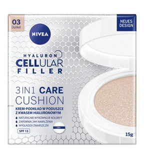 Nivea Hyaluron Cellular Filler - przeciwzmarszczkowy krem-podkład w poduszceChcesz, by Twoja skóra wyglądała pięknie i jednocześnie naturalnie? Wybierz Hyaluron Cellular Filler 3W1 pielęgnujący krem-podkład w poduszce z SPF15! Innowacyjna formuła wzbogacona kwasem hialuronowym zapewnia młody wygląd skóry. Delikatnie kryjące pigmenty łatwo dopasują się do naturalnego koloru Twojej skóry, pokazując jej piękno i blask bez efektu maski. Pielęgnująca formuła nawilża Twoją skórę przez 24h, sprawiając,