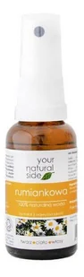 Naturalna woda rumiankowa marki Your Natural Side. Produkt wykazuje działanie łagodzące. Ponadto, przyśpiesza gojenie i regenerację naskórka, a także perfekcyjnie nawilża. Dzięki swoim właściwościom jest szczególnie polecana do cery wrażliwej, delikatnej, podrażnionej, zaczerwienionej, zniszczonej, problematycznej oraz naczyniowej. Sprawdzi się również do pielęgnacji włosów jasnych (nabłyszcza i rozjaśnia kosmyki, chroni je przed wysuszeniem, a także wzmacnia cebulki, jednocześnie hamując proces wypadania włosów oraz stymulując wzrost nowych. Subtelna nuta zapachowa uspokaja, łagodzi stany bezsenności i histerii.Woda rumiankowa.Działa łagodząco, kojąco i uspokajająco.Może być stosowany na włosy, twarz, ciało oraz skórę wokół oczu.Produkt wegański. SPOSÓB UŻYCIA:- JAKO TONIK/MGIEŁKA DO TWARZY - rozpylić wodę bezpośrednio na skórę twarzy, dekoltu i szyi zaraz po zabiegu oczyszczania. Można również użyć wacika. Pozostawić do wchłonięcia, lub zaaplikować wybrany olej. Dzięki swoim niezwykłym właściwościom, woda wzmocni jego działanie oraz sprawi, że olej szybciej się wchłonie.- JAKO DODATEK DO MASECZEK I PEELINGÓW - dodać wodę kwiatową do przygotowywanej maseczki w proszku lub peelingu tak, aby uzyskać odpowiednią konsystencję specyfiku oraz dodatkowo wzmocnić jego działanie. - JAKO KOJĄCY KOMPRES DLA ZMĘCZONYCH I OPUCHNIĘTYCH POWIEK - nasączyć wacik wodą, a następnie nałożyć na powieki. Przed nałożeniem kompresu, można schłodzić wodę kwiatową w lodówce, aby uzyskać dodatkowy efekt chłodzenia.- JAKO DODATEK DO GOTOWYCH PRODUKTÓW - dodać wodę do kremu, balsamu, maski do włosów bądź innego specyfiku w ilości według uznania. Produkt można także zmieszać w dłoni bezpośrednio przed nałożeniem.- JAKO ODŚWIEŻAJĄCA MGIEŁKA DO CIAŁA I WŁOSÓW - rozpylić wodę bezpośrednio na skórę lub włosy.- JAKO ŁAGODZĄCA WODA PO GOLENIU I DEPILACJI - rozpylić wodę bezpośrednio na miejsca po goleniu i depilacji, aby ukoić podrażnioną skórę i zapobiec stanom zapalnym.- PREPARAT DO SKÓRY GŁOWY - wetrzeć wodę w skórę głowy przed lub po umyciu włosów, aby ukoić podrażnioną skórę skalpu, zlikwidować łupież, łojotok oraz swędzenie.