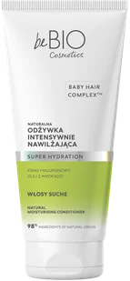 beBIO Cosmetics Baby Hair Complex Naturalna Odżywka Intensywnie Nawilżająca 200mlNaturalna odżywka intensywnie nawilżająca została opracowana z myślą o włosach suchych, matowych i pozbawionych blasku. Dzięki formule z kompleksem Baby Hair Complex (peptyd + adaptogen) wspiera odbudowę pasm, wzmacnia ich odporność na uszkodzenia i przywraca zdrowy wygląd. Hexapeptyd wygładza i zapobiega łamliwości, ashwagandha poprawia kondycję włosów i reguluje produkcję sebum, a kwas hialuronowy intensywnie nawilża zarówno skalp, jak i pasma, poprawiając ich elastyczność. Olej z awokado chroni przed utratą wilgoci, odżywia i dodaje włosom naturalnego blasku. Regularne stosowanie sprawia, że włosy stają się jedwabiście gładkie, nawilżone i sprężyste.