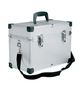 Profesjonalny kuferek otwierany z góry średniej wielkości. Wykonany z aluminium. Bardzo lekki. Posiada czarne okucia na narożnikach. Wewnątrz posiada dużą komorę wyścieloną czarnym materiałem. Ruchomy uchwyt pozwala na swobodne i komfortowe poruszanie się z kuferkiem. Zamykanie na jedną klamrę wyposażoną w 2 zamki. Rewelacyjny dla stylistek paznokci i stylistek rzęs, pomieści wiele akcesoriów. Elegancki i gustowny.