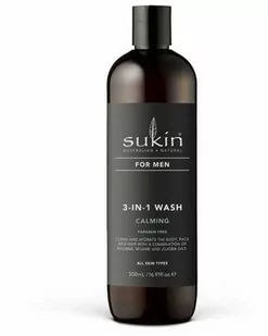 Sukin, FOR MEN, Kojący żel do mycia ciała i włosów 3 w 1 dla mężczyzn, 500 ml Żel do mycia oczyszcza i nawilża ciało, włosy i twarz dzięki połączeniu olejków z baobabu, sezamu i jojoby. Wielozadaniowy żel do mycia ciała, włosów i twarzy z olejkami z aloesu, baobabu, sezamu i jojoby oczyszcza i nawilża. Kojący zapach drzewa cedrowego pielęgnuje nasze zmysły podczas kąpieli. Olejek z aloesu - posiada silne działanie nawilżające, zmiękczające i przeciwutleniające, dlatego stosowany jest w kosmetykach przeciwstarzeniowych i do wrażliwej skóry. Olej z baobabu- znajduje zastosowanie jako środek nawilżający, zmiękczający, wygładzający i regenerujący.