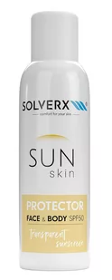 Solverx Sun Skin Protector Mgiełka ochronna do twarzy i ciała SPF50 - Transparentna ochrona dla Twojej skóryTa lekka i wygodna mgiełka zapewnia bardzo wysoką ochronę przed szkodliwym promieniowaniem UVA i UVB, chroniąc Twoją skórę przed oparzeniami słonecznymi, przedwczesnym starzeniem się i przebarwieniami. Zawarta w niej witamina E pielęgnuje skórę, nawilżając ją i odżywiając, a wodoodporna formuła zapewnia ochronę nawet podczas pływania i opalania. Mgiełka jest łatwa w aplikacji, nie pozostaw