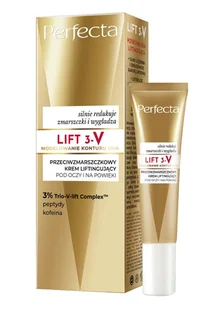 Odkryj sekret młodego, promiennego spojrzenia z kremem pod oczy Perfecta Lift 3-VPerfecta Lift 3-V to zaawansowany preparat przeznaczony do codziennej pielęgnacji delikatnej, cienkiej skóry wokół oczu. Krem działa w oparciu o innowacyjny składnik TrioV-lift Complex - to unikalne połączenie substancji aktywnych silnie wygładza, napina i zapewnia redukcję drobnych zmarszczek, pozostawiając skórę jędrną, elastyczną i pełną młodzieńczego blasku. Regularnie stosowany, krem Perfecta Lift 3-V likwiduje