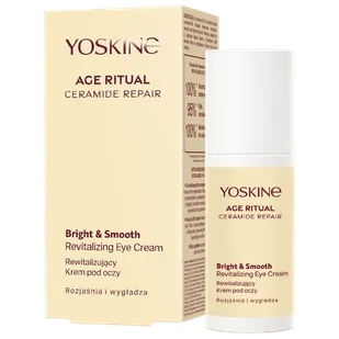 Yoskine Age Ritual Rewitalizujący Krem pod Oczy 30mlYoskine Age Ritual Rewitalizujący Krem pod Oczy to zaawansowany krem wygładzający i nawilżający delikatną skórę wokół oczu. Skutecznie redukuje widoczność zmarszczek i cieni, przywracając spojrzeniu świeżość oraz młodzieńczy blask. Odpowiedni do codziennej pielęgnacji skóry dojrzałej i wymagającej regeneracji. Zawarty w formule kompleks ceramidowo-peptydowy odbudowuje barierę hydrolipidową, zapewniając skórze ochronę i elastyczność. Kompleks Natural Lift działa jak "druga skóra" - napina i wygładza, zapewniając efekt liftingu.