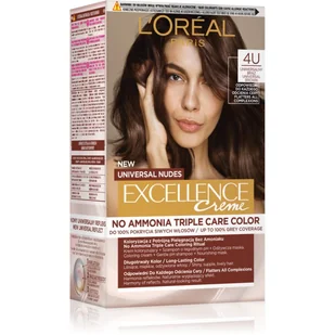 EXCELLENCE Creme - 4U UNIVERSAL BROWN marki LOréal. Farba do włosów. Nie zawiera w składzie amoniaku, co sprawia, że jest łagodniejsza dla włosów i skóry głowy. Została stworzona z myślą o osobach, które oczekują intensywnych, długotrwałych kolorów, jednocześnie dbając o zdrowie swoich włosów. Dzięki innowacyjnej formule skutecznie pokrywa siwe włosy, zapewniając im naturalny efekt doskonale pasujący do każdego typu cery.