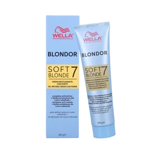 Jest to jedyny produkt z serii BLONDOR, który występuje w formie kremu. Aby uzyskać najlepsze rezultaty kolorystyczne, Wella Blondor Soft Blonde należy wymieszać z Welloxon Perfect w proporcji od 1: 1 do 1: 2. Do aplikacji na skórę głowy należy używać wyłącznie Welloxon Perfect Pastel lub Welloxon Perfect 6%. • Rozjaśnia do 7 poziomów rozjaśnienia • Delikatny dla skóry głowy i włosów • Zawiera lipidy, które pokrywają włosy, chroniąc je przed utratą wilgoci • Posiada kremową konsystencję, ułatwiającą aplikację • Zawiera ekstrakt z rumianku • Pozostawia zdrowe i pełne połysku włosy • Przeznaczony do każdej techniki rozjaśniania Sposób użycia: Rozjaśniacz zmieszaj z preparatem Welloxon Perfect 6%, 9%, 12% lub emulsją Color Touch 1,9%, 4%.