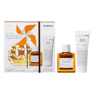 KORRES BLACK PEPPER zestaw prezentowy dla mężczyzn: Woda toaletowa 50 ml + Balsam po goleniu 125 mlOdkryj siłę męskiego charakteru z zestawem prezentowym KORRES BLACK PEPPER. Zainspirowany grecką naturą i filozofią prostoty, zestaw łączy w sobie wodę toaletową oraz balsam po goleniu o tym samym, wyrazistym zapachu. Kompozycję otwierają energetyzujące nuty cytryny, mandarynki i limonki, które przechodzą w aromatyczne serce z lawendą, morskim akcentem i czarnym pieprzem. Całość wieńczy ciepła, drz
