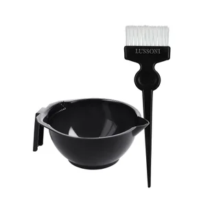 W zestawie znajduje się wysokiej jakości miska do mieszania farby oraz pędzel do koloryzacji . Oba te produkty zapewniają najwyższy komfort podczas pracy fryzjera. Miska LUSSONI została wyposażona w praktyczną rączkę, ułatwiającą korzystanie z tego typu akcesorium. Dodatkowo miseczka posiada miarkę i specjalne ząbki, które usuwają nadmiar farby z pędzla. Dzięki temu miska zapewnia wygodę i precyzyjne odmierzanie produktów.