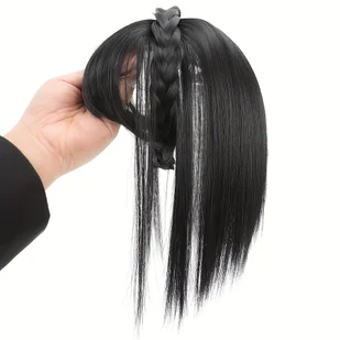 TEMU Stylowa Opaska z Warkoczem z Klipsowym Topperem i Grzywką - Naturalny Wygląd Syntetycznych Prostych Przedłużeń Włosów dla Kobiet, Idealne do