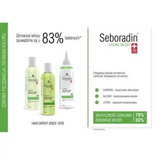DZIAŁANIE I EFEKT: Szampon zawiera bezwonną naftę kosmetyczną, chlorofil, ekstrakt z pokrzywy. Szampon dobrze oczyszcza włosy i skórę głowy, przygotowując je do kolejnych etapów pielęgnacji. Zawartość chlorofilu sprawia, że szampon pogłębia kolor ciemnych włosów włosów i utrzymuje ich barwę. Dzięki obecności bezwonnej nafty kosmetycznej włosy stają się odżywione i pełne blasku, a dodatek ekstraktu z pokrzywy sprawia, że Seboradin Ciemne Włosy wzmacnia włosy, zapobiega ich przetłuszczaniu i pojawieniu się łupieżu. Włosy są miękkie, nawilżone i lśniące.