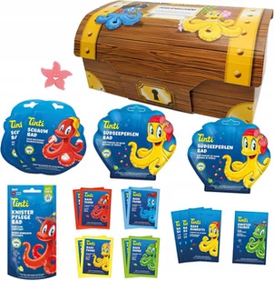 Tinti skrzynia skarbów, 18-częściowa zabawa z ekscytującymi produktami zapewnia urozmaicenie i niespodziankę w wannie. Produkty Tinti pielęgnują delikatną sk...