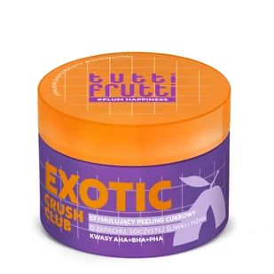 Farmona Tutti Frutti Exotic Crush Club Stymulujący Peeling Cukrowy 250gFarmona Tutti Frutti Exotic Crush Club Stymulujący Peeling Cukrowy to tropikalny rytuał wygładzający, który natychmiast poprawia wygląd skóry. Energetyzujący zapach soczystej śliwki i głębokiego piżma dodaje mocy, a treściwa konsystencja zapewnia efekt miękkiej, "insta ready" skóry już po pierwszym użyciu. Cukier, sól i pestki truskawki skutecznie złuszczają, a kwasy AHA, BHA i PHA wspierają mikrozłuszczanie i przywracają blask. Witamina C dodaje glow, a ekstrakt ze śliwki wygładza i poprawia elastyczność skóry. Regularne stosowanie pomaga w ujędrnieniu oraz poprawie jej gładkości.