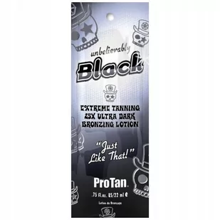 ProTan ProTan Unbelievably Black Ekstremalnie Opalający ProTan Unbelievably Black 250ml Bronzer. Ekstremalnie opalający 25-krotnie ultra ciemny brązujący balsam. Ten balsam pozwoli Ci odzyskać wiarę w moc intensywnych i długotrwałych efektów! Wyjątkowo skuteczne połączenie przyspieszaczy opalania z ciemnymi bronzerami i szczyptą DHA pozwoli Ci odkryć niespotykane dotąd złociste tony opalenizny. Naturalne, egzotyczne ekstrakty, aloes i magiczne silikony zapewniają doskonałe właściwości kondycjonujące, dzięki którym skóra stanie się zdrowa i promienna. Formuła bez parabenów zapewni wspaniały, głęboki, długotrwały i najciemniejszy kolor brązu, jaki tylko możesz sobie wyobrazić.