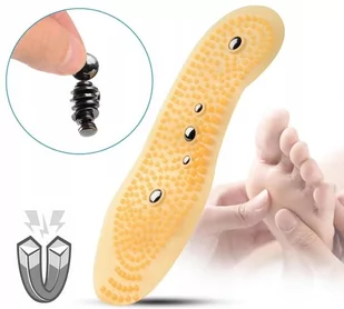 Możliwość docięcia do odpowiedniego rozmiaru buta. Wkładki występują w jednym uniwersalnym rozmiarze - 36/46 Są do docinania, najlepiej wyjąć wkładkę z obuwia do którego są przeznaczone i przy pomocy starej wkładki dociąć do pożądanego rozmiaru. Można również położyć nogę na wkładce, odrysować stopę i dociąć. Działanie wkładek magnetycznych : ✔ Wykonane są z wysokiej jakości tworzywa silikonowego ✔ Górna część wkładki pokryta jest wypustkami masującymi ✔ Wkładki wyposażone są w 5 magnesów pozytywnie działających na receptory w stopach.