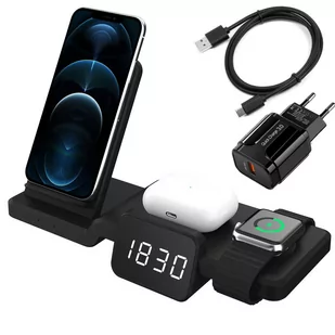 Opis i cechy produktu: Biurkowa stacja dokująca do ładowania smartfonów, zegarków Apple Watch oraz słuchawek ładowanych bezprzewodowo Posiada cyfrowy zegarek z opcją wyświetlania daty i/lub czasu (12/24h) z dodatkową regulacją poziomu jasności wyświetlacza Inteligentny system podziału napięcia dla urządzeń zapewniając skuteczne i bezpieczne ładowanie W zestawie kabel USB-C o długości 100cm oraz ładowarka sieciowa do gniazdka (9V/2A) Stacja posiada w tylnej części dodatkowe gniazdo USB-A dla umożliwienia ładowania dodatkowego (czwartego) urządzenia po kablu (w tym przypadku zalecana jest mocniejsza ładowarka sieciowa np. 9V/3A) Instrukcje dodatkowe: W celu ustawienia daty/czasu należy dłużej przytrzymać boczny przycisk "+" aż cyfry zaczną mrugać W trybie mrugania przyciski +/- zmieniają wartości, natomiast przycisk "M" przełącza poszczególne tryby W trybie normalnym (bez mrugania) przycisk M przełącza opcję wyświetlania: Data i czas lub tylko czas Długie przyciśnięcie "M" wygasza całkowicie ekran (krótkie naciśnięcie włącza go ponownie) * Na spodzie stacji jest miejsce na dodatkową opcjonalną baterię guzikową CR2032 służącą do zachowania ustawień czasu i daty po odłączeniu kabla zasilającego ** Na wyświetlaczu zegarka jest folia ochronna, przed użyciem należy ją zdjąć Wspierane urządzenia: Smartfony z funkcją ładowania bezprzewodowego Apple Watch 2/3/4/5/6/7/SE Słuchawki AirPods 2/3 / AirPods Pro i inne urządzenia posiadające funkcję ładowania bezprzewodowego Model: