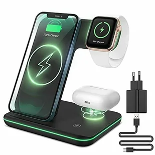 CAVN Bezprzewodowa ładowarka 3 w 1, kompatybilna z iPhone 13, 12, 11 Pro Max/XS/XR/X/8+, iWatch Ultra / 8/7/6/SE/ 5/4/3/2, AirPods Pro/2/3, Galaxy S22 S21/S20/S10+, indukcyjna stacja ładująca • Szybka ładowarka 3 w 1 z adapterem QC 3. 0 - kompatybilna ze stacją ładującą iPhone 13. Stacja ładująca 3 w 1 umożliwia ładowanie kilku urządzeń jednocześnie w jednym miejscu, uporządkowane i uporządkowane. Ładuj jednocześnie swój telefon, iWatch, Airpods, również jako uchwyt na telefon. Stojak ładujący jest zasilany za pomocą dołączonego adaptera QC-3.