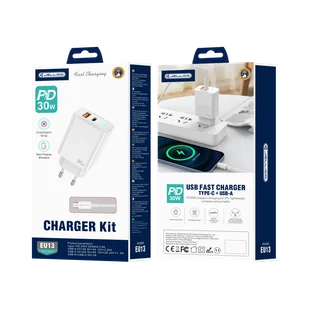 JELLICO ładowarka sieciowa - EU13 GaN PD 30W 1x USB-C + 1x USB QC3.0 + kabel USB-C / USB-C zestaw biały