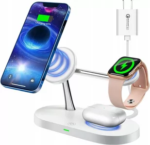 ⚡Multi-Device Travel Charger MagSafe 4w1⚡Bezprzewodowa Ładowarka Indukcyjna Qi Stojak | 15W Do Apple 4in1 Wireless Charger with Magsafe 15W Stacja ładująca 4w1 umożliwia szybkie indukcyjne ładowanie iPhone'a, Apple Watcha i AirPodsów. Dodatkowo, posiada wyjście USB z możliwością ładowania dowolnego sprzętu. Prosty, minimalistyczny design doskonale sprawdzi się w każdym wnętrzu i doskonale komponuje się ze sprzętami Apple. Dedykowana jest dla szybkiego ładowania najnowszych smartfonów Apple wyposażonych w system MagSafe. Ładowarka posiada złącze MagSafe do ładowania iPhone'a, złącze magnetyczne Apple Watch, ładowarkę Qi dla Apple AirPods i port USB.