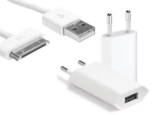 Ładowarka sieciowa zasilacz + kabel usb iPhone 4 4s iPod 30pin. Zestaw umożliwia szybkie ładowanie urządzeń Apple, zaś sam przewód przesyłanie danych i ich synchronizację z komputerem, można go podłączyć do innej ładowarki np. samochodowej.