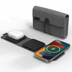 🔷 Ładuj 4 urządzenia jednocześnie – Wyznaczone punkty ładowania bezprzewodowego dla telefonu i słuchawek AirPods oferują wspólną moc wyjściową do 5W-15W. Ładowana przez port USB-C. Idealna dla posiadaczy wielu gadżetów. 🔷 Zoptymalizowana do podróży – Składana, kompaktowa konstrukcja ułatwia pakowanie i transport. Cała konstrukcja spoczywa na wysokiej jakości materiale, który po złożeniu amortyzuje całą stację ładującą. Bez problemu zmieści się w torbie czy plecaku, eliminując potrzebę zabierania wielu ładowarek. 🔷 Technologia MagSafe – Magnetyczne mocowanie zapewnia precyzyjne i bezpieczne ładowanie iPhone'a, utrzymując go w idealnej pozycji do oglądania treści. 🔷 Elegancki design – Wykonana w czarnym kolorze, stacja prezentuje się nowocześnie i minimalistycznie, doskonale pasując do każdego wnętrza czy stanowiska pracy.