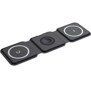 Opis i cechy produktu: Funkcjonalna, nowoczesna ładowarka bezprzewodowa pozwalająca jednocześnie telefonu, zegarka Apple Watch oraz słuchawek AirPods Ładowarka posiada elastyczny przegub, umożliwiający jej składanie w dowolną stronę Cewka dla Apple Watch posiada funkcję magnetycznego przywierania Cewka dla smartfonów również posiada wbudowane magnesy, co wspomaga pozycjonowanie modeli iPhone z funkcją MagSafe Obszar do ładowania smartfonów może być również używany do naładowania etui AirPods 2 lub AirPods Pro W zestawie kompatybilna ładowarka sieciowa Uwaga: Każda z cewek ma inne parametry, dlatego telefon należy umieścić na lewej cewce (z symbolem magnesu), AirPods na prawej cewce (z symbolem błyskawicy), Apple Watch na centralnej cewce Wspierane urządzenia: Smartfony: Wszystkie obsługujące ładowanie bezprzewodowe Zegarek: Apple Watch 1/2/3/4/5/6/7/8/SE Słuchawki bezprzewodowe: