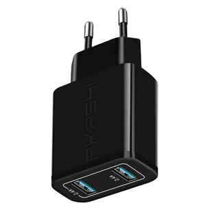 Ładowarka z dwoma wyjściami USB-A firmy Akashi. Maksymalny prąd wyjściowy 2,4 A do szybkiego ładowania urządzeń. Jednoczesne ładowanie Twoich urządzeń. Kompaktowa konstrukcja. Bezpieczne ładowanie.