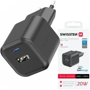 Swissten Travel Charger GaN USB-C 20W PD / USB-A 18W QC Szybkie i efektywne adowanie adowarka Swissten Travel Charger GaN to nowoczesne rozwizanie, ktre zapewnia byskawiczne i efektywne adowanie Twoich urzdze mobilnych. Dziki maksymalnej mocy 20W przez port USB-C oraz 18W przez port USB-A, naadujesz swoje urzdzenia w mgnieniu oka, co czyni j doskonaym towarzyszem w podry. Technologia GaN Wydajno i bezpieczestwo Wykorzystanie technologii GaN (azotek galu) w tej adowarce pozwala na znaczne zmniejszenie jej rozmiarw, jednoczenie zwikszajc wydajno. Pprzewodniki z azotku galu s bardziej efektywne ni tradycyjne krzemowe, co eliminuje problem przegrzewania i zapewnia dugotrwae uytkowanie. Ochrona przed przegrzaniem i przecieniem Swissten Travel Charger GaN jest wyposaona w szereg zabezpiecze, ktre chroni Twoje urzdzenia przed zwarciem, przecieniem, nadmiernym adowaniem oraz wysok temperatur.